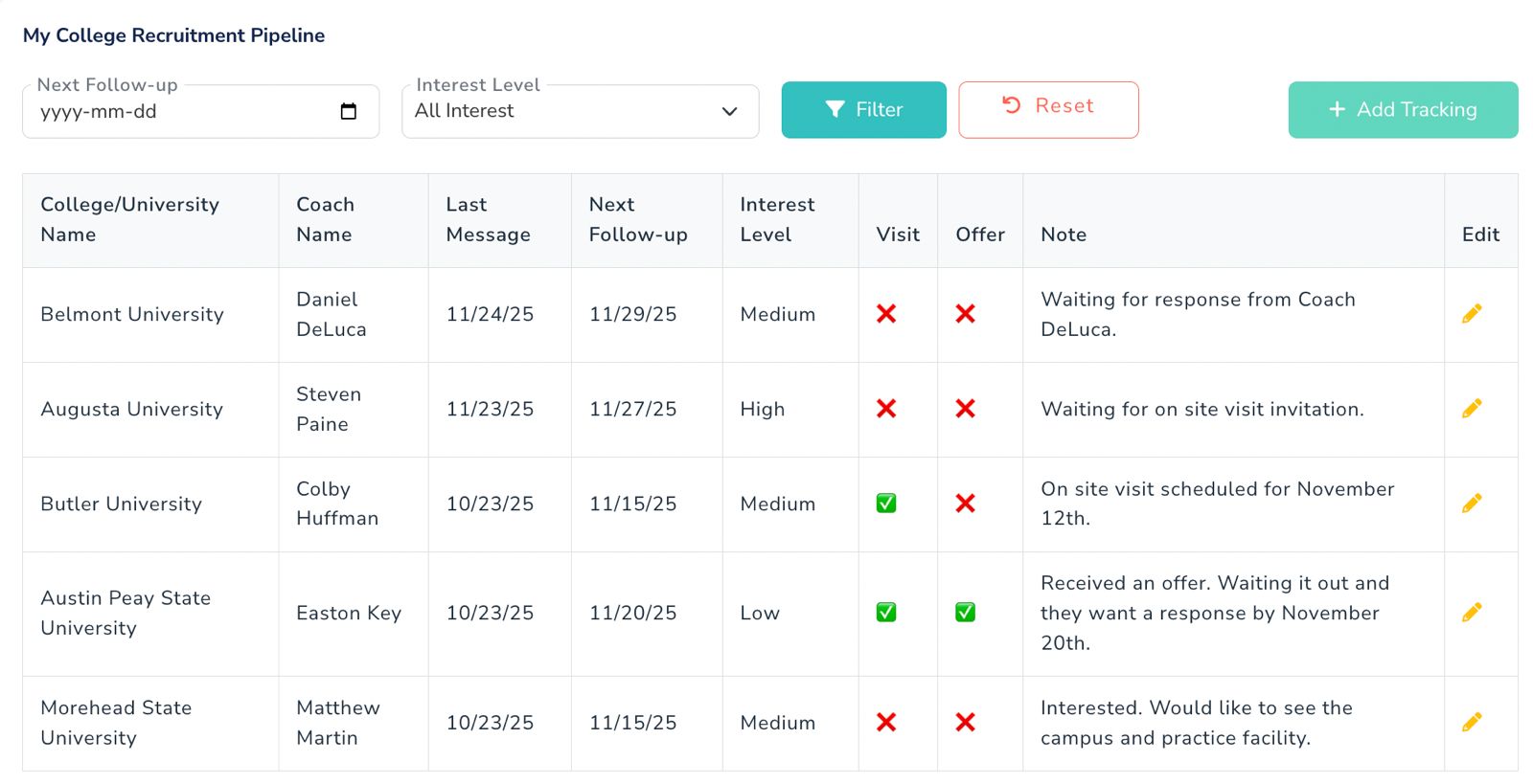 Your recruitment profile is designed with college coaches in mind, showcasing your achievements, academics, and personal achievements—all the key details they need to assess you as a recruit. Create Your College Pipeline As you connect with college coaches, keep track of the schools you’ve engaged with. Think of recruitment like a sales process—stay proactive, follow up, and work toward finding the perfect college program for you.